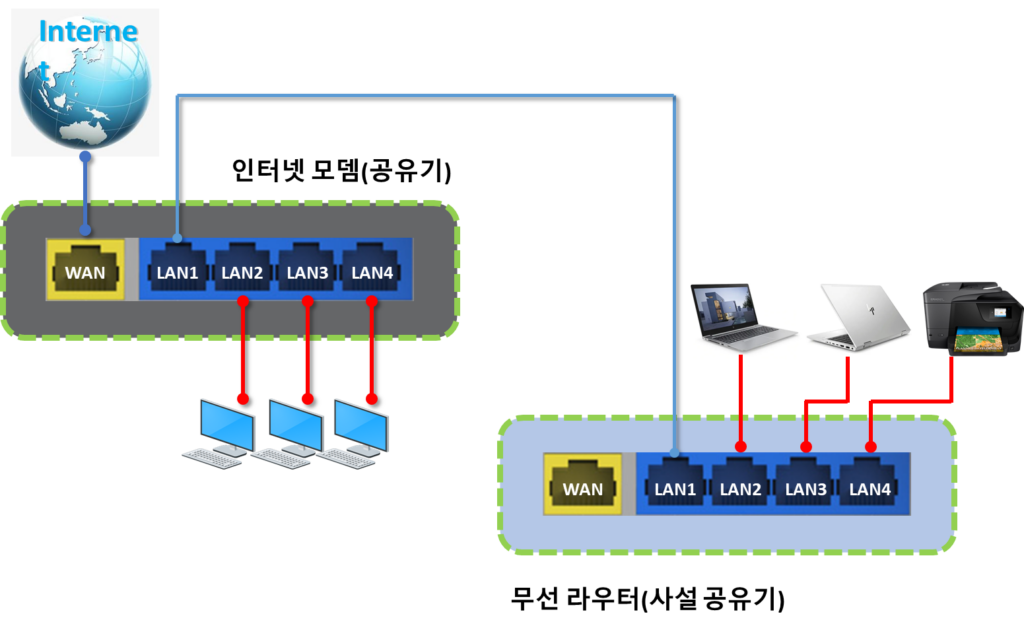 - 모뎀 → 공유기 순서로 ON